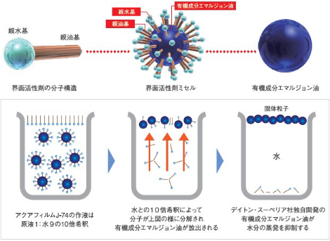 水で10倍に希釈されることによりアクアフィルムJ74は分子が分解され、放出された有機成分エマルジョン油が蓋となり水分の蒸発を抑制します。