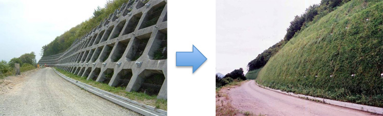 カエルドグリーン工法は、自然復元に有効な自然表土や、これまで廃棄処分していた建設発生土(掘削土・濁水処理ケーキ・浚渫土)などを空気圧送の可能な耐久性に優れた“植生基盤土壌”としてリサイクルする法面緑化工法です。