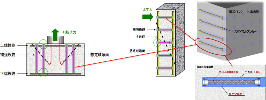 「スパイラルアンカー」は、供用中の鉄筋コンクリート構造物を対象に、あと施工でせん断補強を行うために開発された技術です。